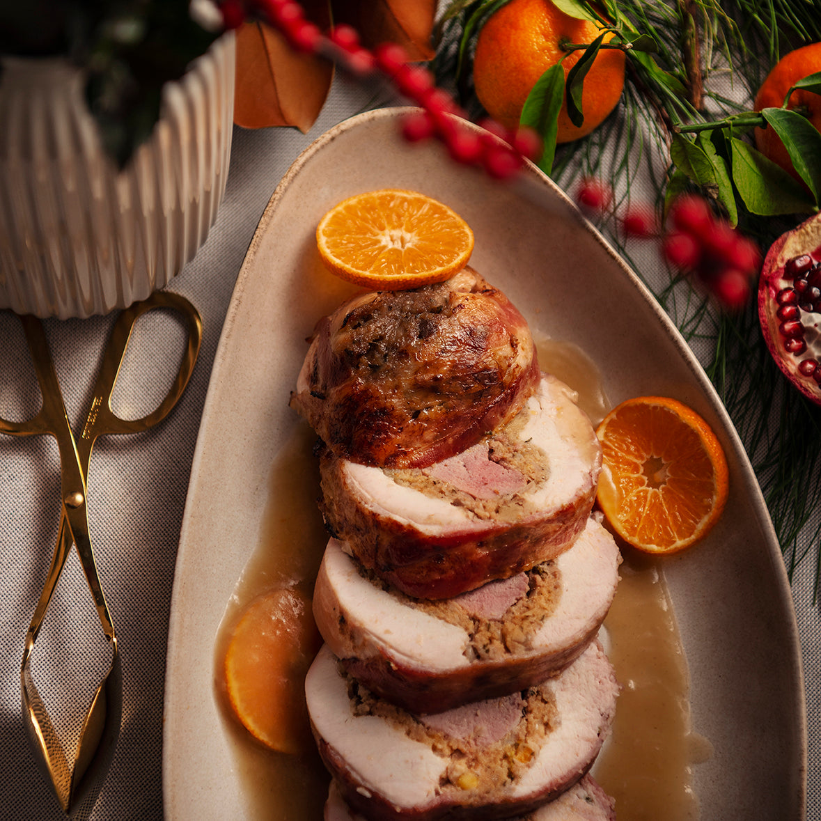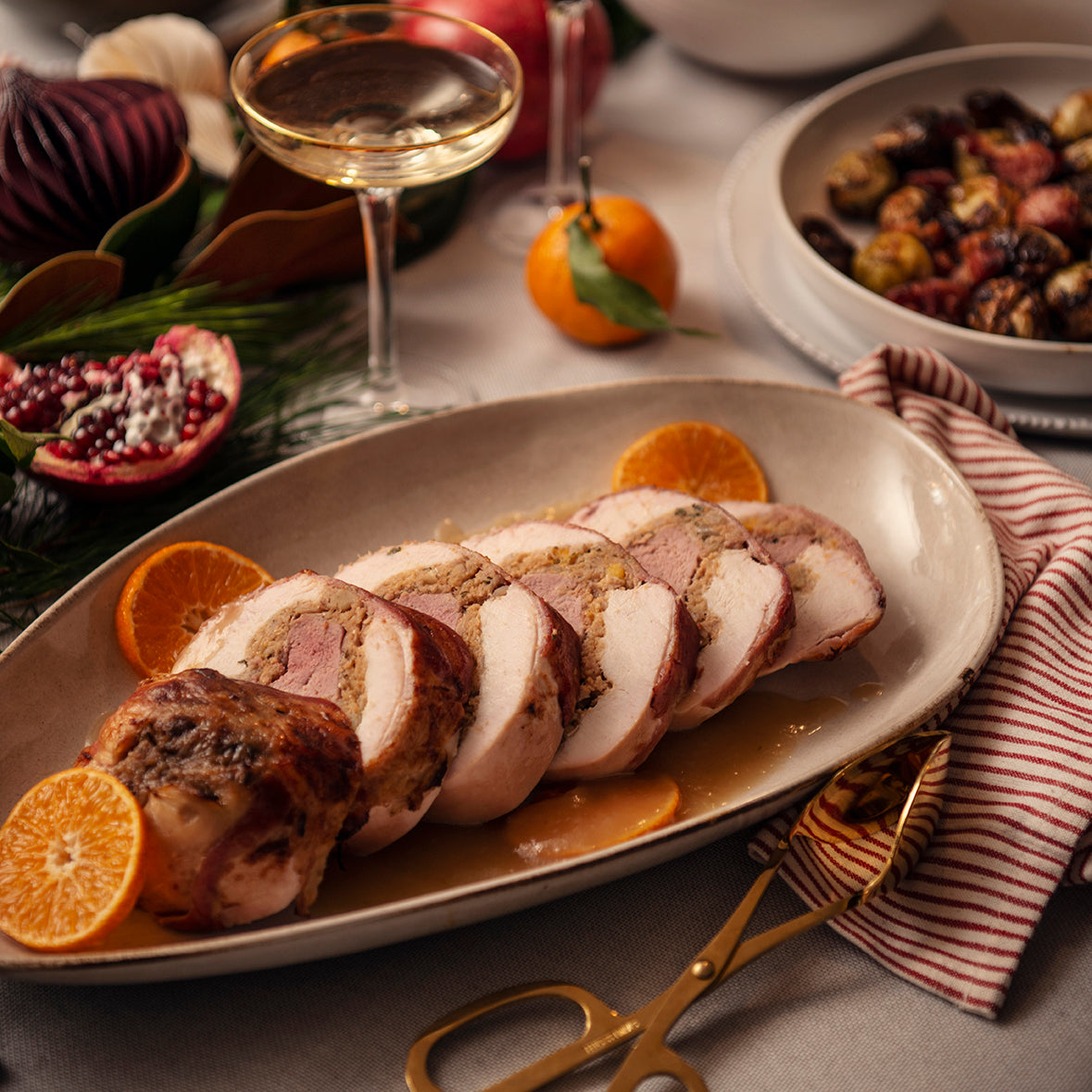 Celebrate the season with our Festive Turduck Roast, featuring succulent apricot sausage stuffing and a rich brandy game jus for $249.